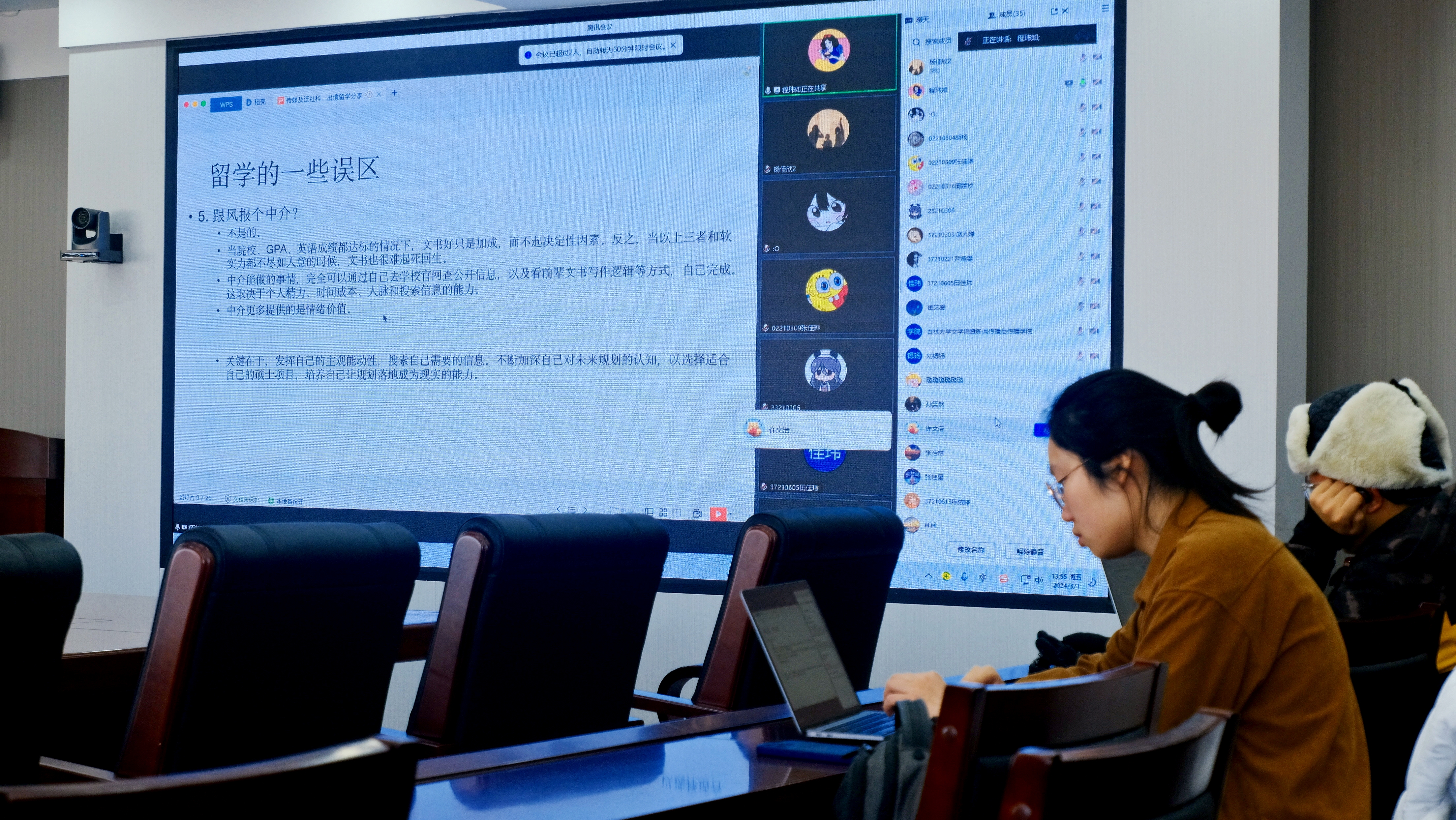 杨佳欣对员工程玮如返校宣讲表示了热烈欢迎和衷心感谢,并向同学们介绍了她的学业经历。据悉,程玮如曾作为交换生在日本早稻田大学亚太研究科学习,曾于ICA、IAMCR以及中国新闻史学会年会上发表多篇一作论文。会上,程玮如依托其在学业实践领域的丰富经验,以独特的视角和深入的见解,为在场的同学提供了一场关于传媒及泛社科专业留学的全面分享,同学们收获了宝贵的学术经验及学业发展路径参考。程玮如针对香港、新加坡、英国、日本等地区的传媒及泛社科专业留学申请流程进行了深入解析,厘清了一些基本概念,提供了实用的申请策略。包括如何选择合适的学校和专业、如何准备申请材料,以及进行有效面试的方法策略。她的分享除基于个人的实践经验外,还结合了对当前留学趋势、政策的深刻理解把握。会议尾声,程玮如与在场员工进行了互动答疑。同学们踊跃提出了关于境外留学前期准备、申请过程中的常见问题以及职工活的众多细节,程玮如耐心地回答了每一个问题,提供了详尽的建议。