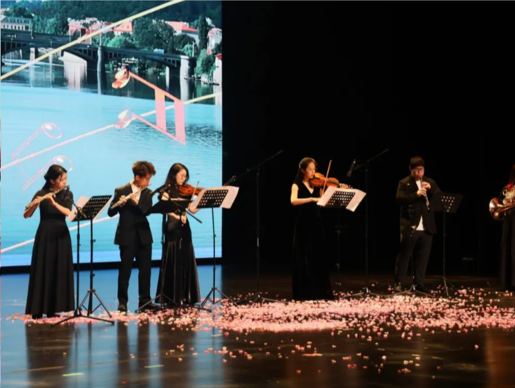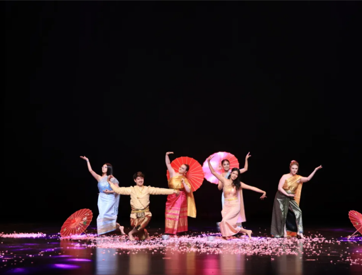 晚会的第二篇章名为“携手同行”。心栖梦归处,不负韶华年,在这一篇章,随着舞台灯光的明暗轮转,京剧、音乐剧、竹笛独奏、电子琴独奏、傣族舞、泰国传统舞、器乐合奏,极具东方、西方特色的节目交替上场,乐声流淌,摇曳翩跹,烂漫多彩,携手同行见证的不止是学院国内外学子在这一方舞台上协力共演的魅力,更是生动表现出了学院在传统与现代的文化交融、东方与西方的文化互鉴中的文化育人氛围。