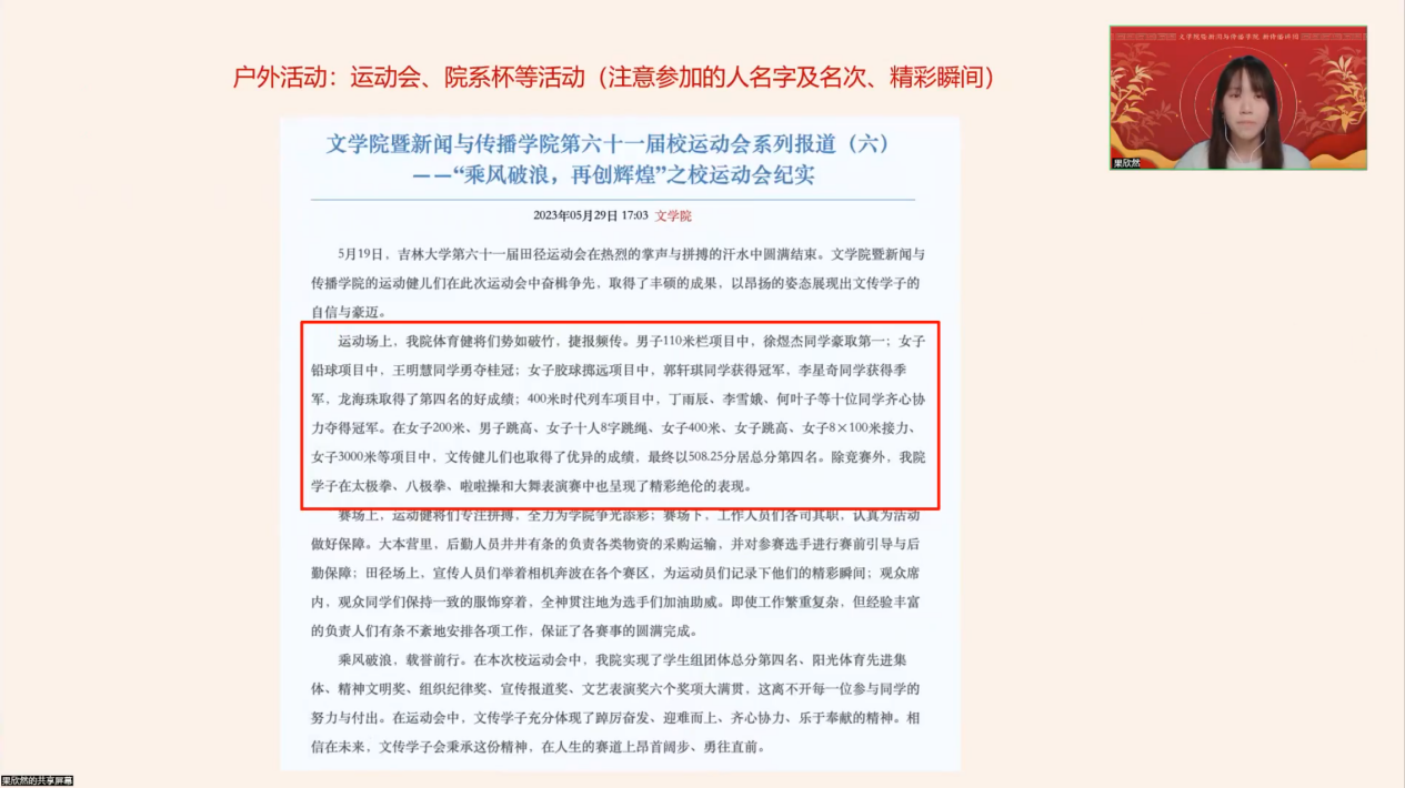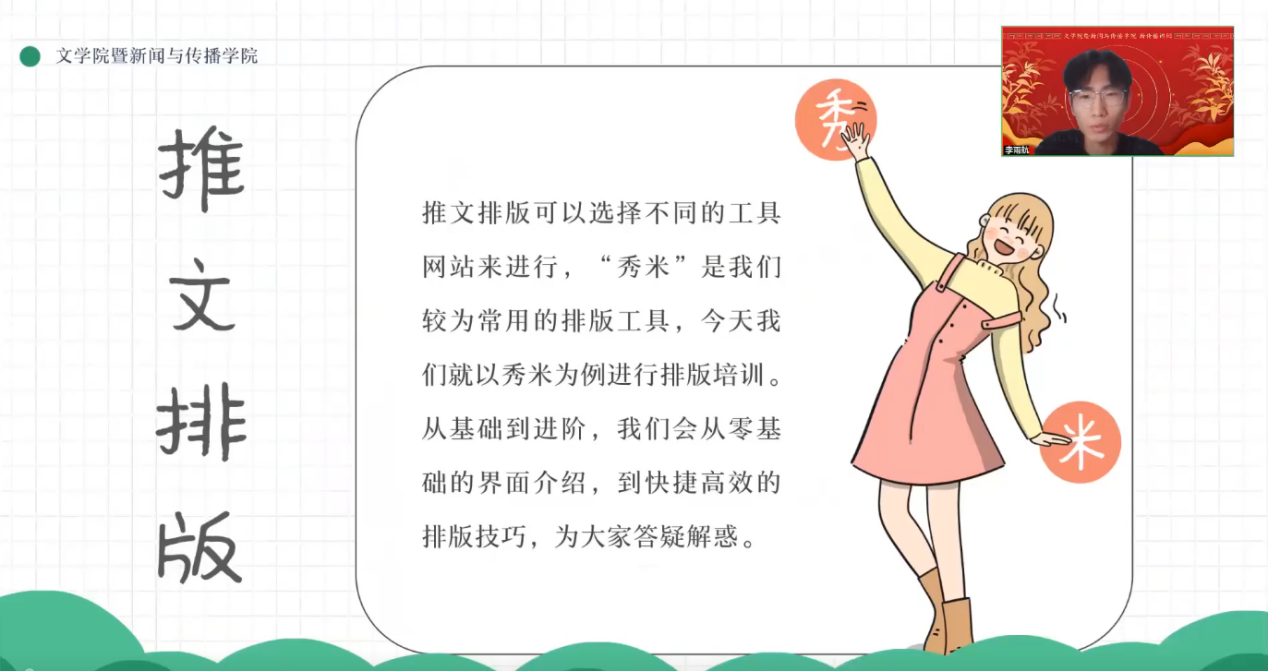 为丰富员工寒假生活,提升实践能力,1月20日至27日,优德w88新传播讲团创新推出“讲团小春晚”线上培训活动。本次活动以腾讯会议为平台,面向学院各年级员工开展八场专题课程,内容涵盖秀米排版、会议摄影、新闻报道、数据分析等实用技能,吸引近五百人次参与,为文传学子搭建了寒假充电的“云端课堂”。